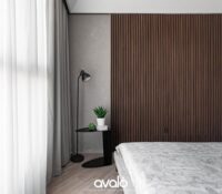 Các mảng tường hạn chế các chi tiết rườm rà, dễ bị nhàm chán. Thay vào đấy là những diện lớn các chất liệu ốp cao cấp được xử lý tinh tế. Tất cả hệ thống nan gỗ này được Avalo chọn gỗ công nghiệp để tránh tuyệt đối việc bị cong vênh co ngót. Và luôn sử dụng thương hiệu của An Cường để đảm bảo cao nhất về chất lượng sản phẩm. Tuy nhiên, đơn vị uy tín như An cường cùng có những lô hàng không thực sự đồng nhất về màu sắc. Nhưng cũng là lựa chọn không thể tốt hơn trên thị trường gỗ Công nghiệp ở Hà thành.
