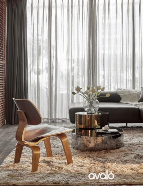 Ánh sáng tự nhiên xuyên qua lớp rèm voan xuyên thấu.