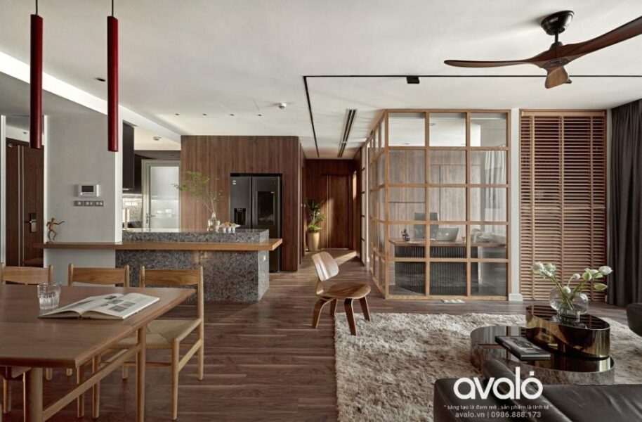 Vách gỗ tự nhiên và kính trong suốt ngăn cách giữa phòng khách với phòng đa năng.