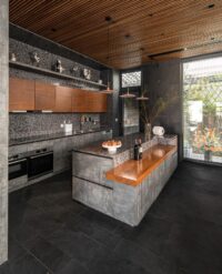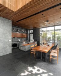 Công trình biệt thự được thi công với chất liệu gỗ công nghiệp vân bê tông trần, đá thạch anh có vân vỏ sò lạ mắt. Kết hợp với gỗ gõ tự nhiên và sàn gạch vân đá tảng, mang lại một bố cục sang trọng, mạnh mẽ và khác lạ.