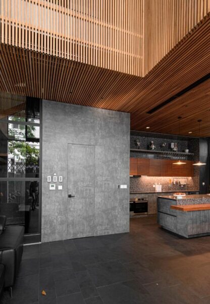 Kỹ thuật sử dụng cửa ẩn được sử dụng khiến cho chi tiết của ngôi nhà trở nên tinh giảm và cô đọng. Đây cũng là một trong nhiều yếu tố làm nên phong cách thiết kế nội thất Đương Đại.