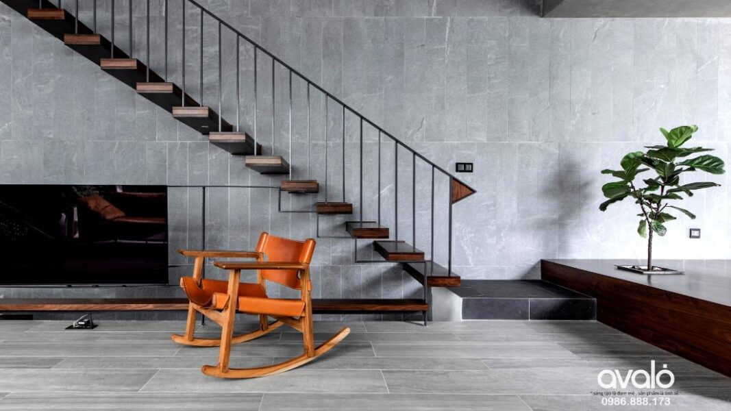 Cầu thang bộ bay bổng, dẫn chủ nhà lên tầng cao và xuống tầng hầm đầy trải nghiệm. Đây là những bậc thang mảnh và nhẹ như bay, người sử dụng không khỏi bị cảm xúc khi đi lại ở những bậc thang này. Chiếc ghế Spanish Chair kinh điển là chỗ ngồi yêu thích của gia chủ, ngồi ở đây có thể nhìn ngắm được những cụm không gian đẹp nhất của ngôi nhà.