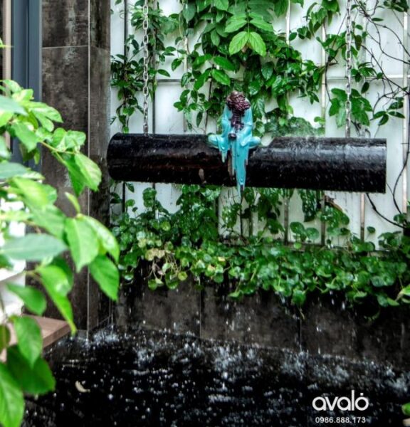 Sân trước của ngôi nhà là nơi chào đón gia chủ mỗi lần vào cổng, được thiết kế một bức tường mưa với decor Thiền sư đang ngồi thiền dưới mưa trên một thân gỗ mục. Về góc độ Phong Thủy thì thác nước này như thanh lọc mọi bụi trần, để vào nhà chỉ còn là không khí sạch. Bức tượng sử dụng ở đây là tượng Ngài Đạt Ma Sư Tổ – Trụ trì chùa Thiếu Lâm. Mang một sức mạnh của nhà Phật trấn trừ hết mọi phiền muộn hay vong ma không cho bước vào nhà.